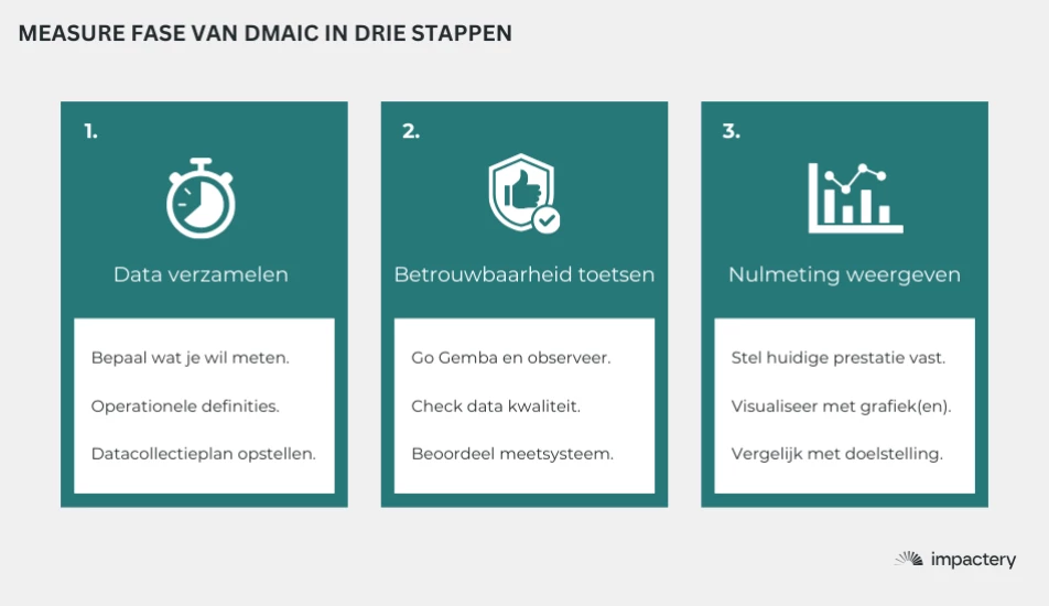 In deze fase kwantificeer je het probleem met nauwkeurige, betrouwbare data. Dit vormt de basis voor een objectieve analyse.