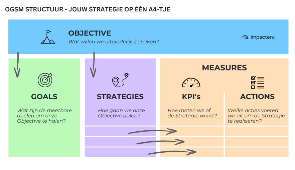 De OGSM-methode helpt organisaties om hun strategie in vier heldere stappen op te delen: wat wil je bereiken, hoe meet je succes, welke wegen volg je om daar te komen, en hoe volg je de voortgang? Het is een simpele maar krachtige manier om focus te creëren en iedereen binnen de organisatie op dezelfde lijn te krijgen. Door de strategie op één A4’tje samen te vatten, wordt het voor zowel leidinggevenden als medewerkers duidelijk wat het doel is en hoe dat te bereiken. De vier onderdelen van OGSM zijn als volgt: